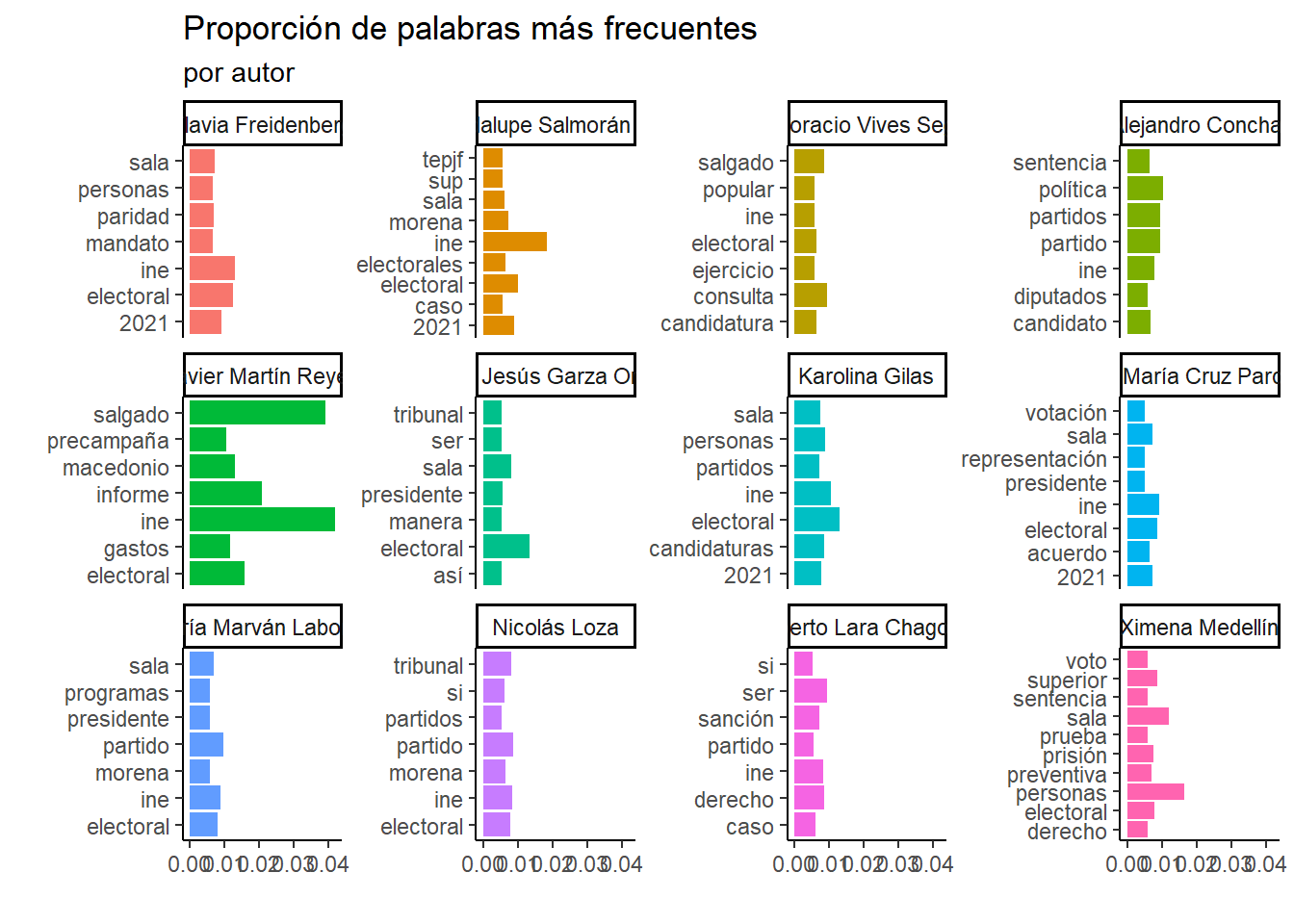 final %>%unnest_tokens(palabra, texto) %>%filter(!palabra %in%stopwords("es")) %>%count(autor, palabra, sort = T) %>%group_by(autor) %>%mutate(prop = n /sum(n)) %>%top_n(7) %>%ggplot(aes(x = prop, y = palabra, fill = autor)) +facet_wrap(. ~ autor, scales ="free_y") +geom_bar(stat ="identity") +theme_classic() +theme(legend.position ="blank") +labs(x ="", y ="",title ="Proporción de palabras más frecuentes",subtitle ="por autor" )