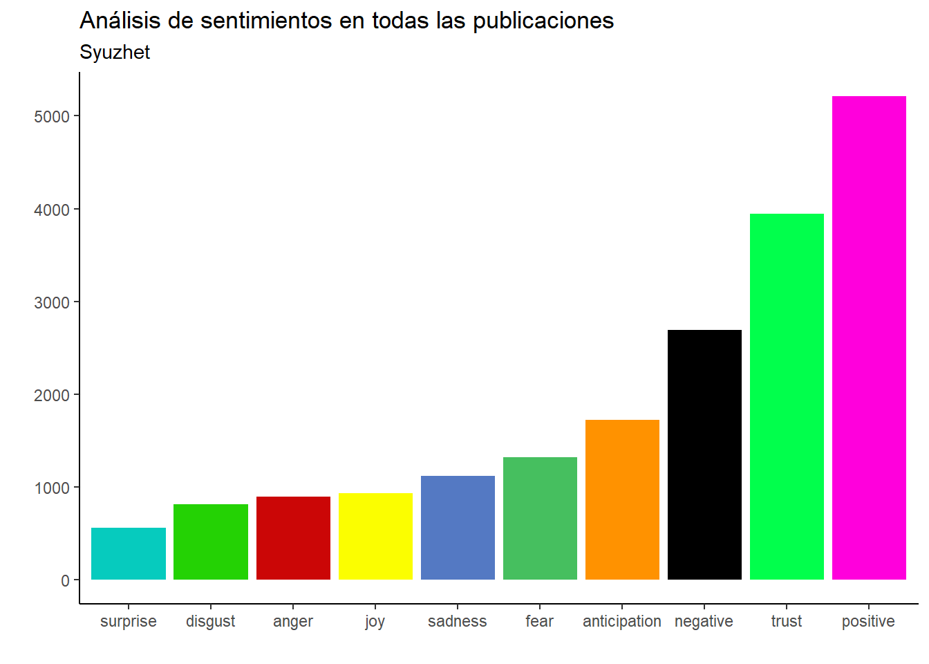 text <- final %>%unnest_tokens(palabra, texto) %>%filter(!palabra %in%stopwords("es"))text_nrc <-get_nrc_sentiment(char_v = text$palabra, language ="spanish")bind_cols(text, text_nrc) %>%pivot_longer(cols =6:15 ) %>%group_by(name) %>%summarise(total =sum(value)) %>%ungroup() %>%mutate(name =reorder(name, total)) %>%ggplot(aes(x = name, y = total, fill = name)) +geom_bar(stat ="identity") +scale_fill_manual(breaks =c("disgust", "surprise", "anger", "joy", "anticipation", "fear", "sadness", "trust", "positive", "negative"),values =c("#24D204", "#06CBBE", "#CB0606", "#FBFE00", "#FF9200", "#46BF5F", "#5479C3", "#01FF4C", "#FF00DC", "#000000") ) +theme_classic() +labs(title ="Análisis de sentimientos en todas las publicaciones",subtitle ="Syuzhet",x ="", y ="" ) +theme(legend.position ="blank")